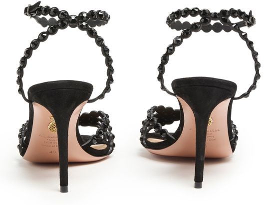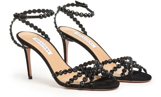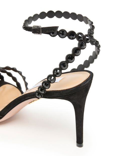 Descrizione: Cinturino alla caviglia, logo stampato, cuciture a vista, dettagli con perline/perle, tacco alto, tacco a spillo, punta tonda, punta aperta.