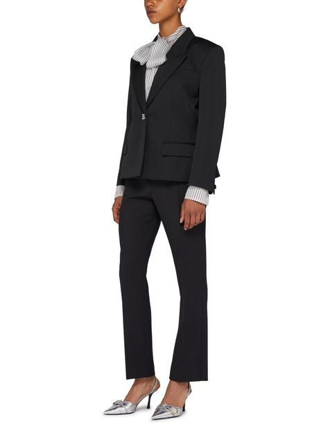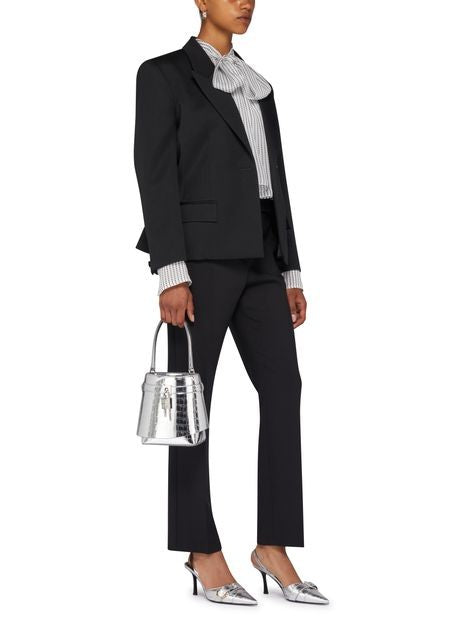 Descrizione: Maniche corte e lunghe, due tasche anteriori, tasche con patta, monopetto, collo a lancia, finitura argento.