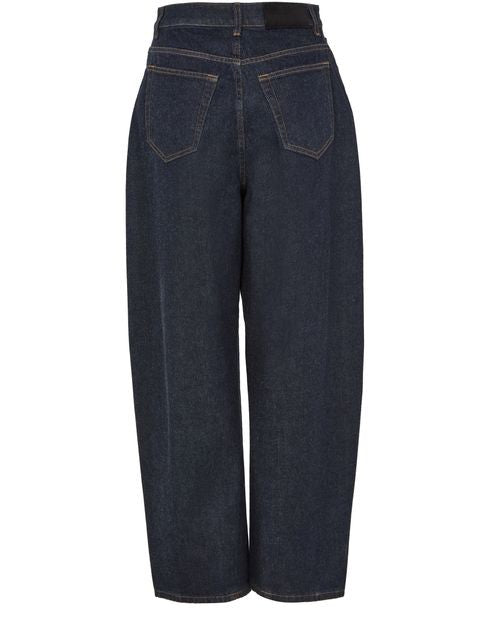 Descrizione: Logo posteriore in pelle, denim sbiadito, due tasche anteriori, tasca posteriore applicata, cuciture a vista, chiusura con cerniera e bottone, passanti per cintura.