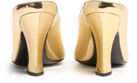 Descrizione: Mules, pelle metallizzata, tacco a blocco, tacco alto, punta affusolata, soletta con logo stampato, cuciture a vista, finitura dorata.