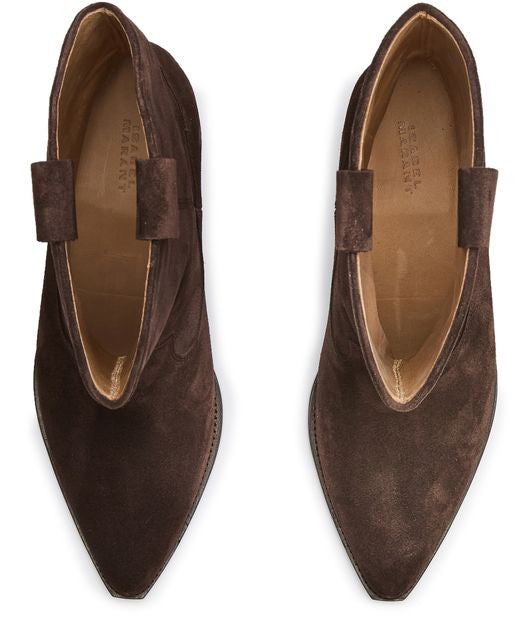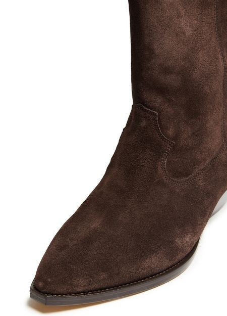Descrizione: pelle scamosciata, tacco medio, punta affusolata, cuciture a vista, modello pull-on, stivali da cowboy.