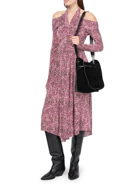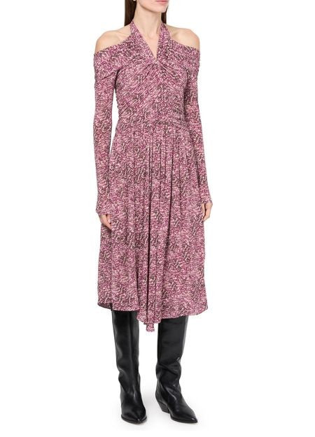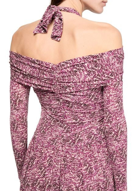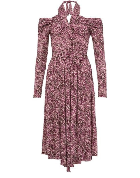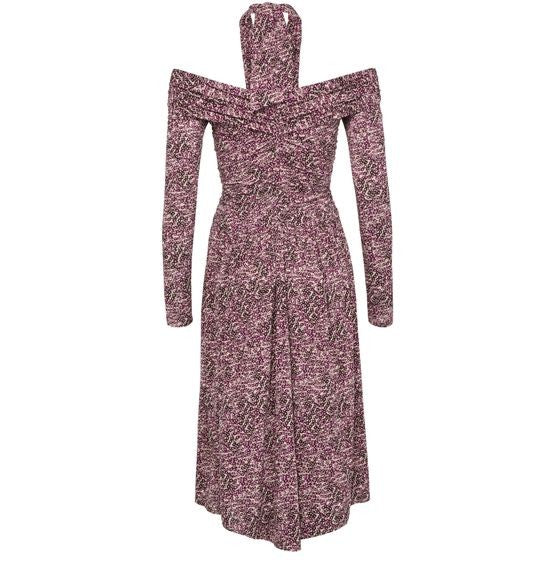 Descrizione: Dettagli drappeggiati, cuciture a vista, abito midi, stampa, stampa all-over, maniche lunghe, spalle scoperte, cocktail e sera, abito svasato, collo lavalier/annodato.