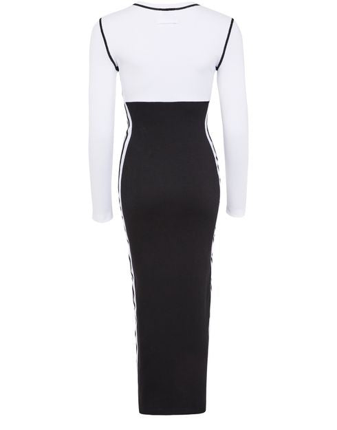 Descrizione: Logo applicato, logo frontale, cuciture a vista, abito midi, scollo rotondo, maniche lunghe, abito in maglia, vita aderente.