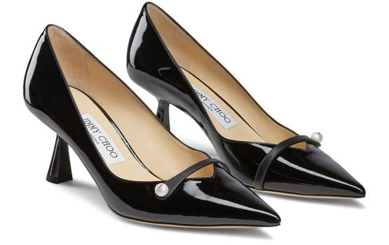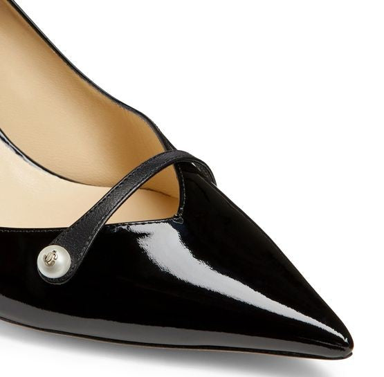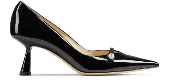 Descrizione: Décolleté, pelle verniciata, tacco a rocchetto, punta affusolata, logo sul retro.