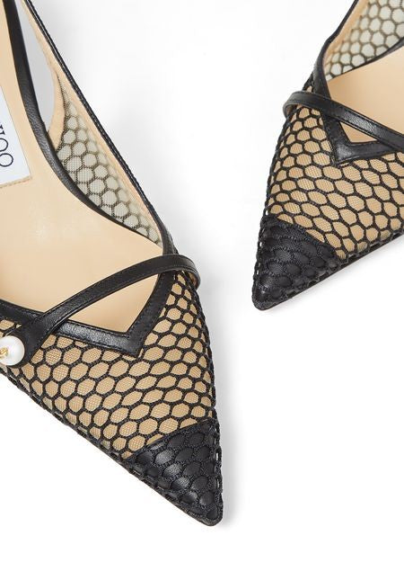 Descrizione: Maglia traforata, dettagli in pelle nera, punta affilata, forma affusolata, dettagli con perline, logo laterale, soletta con logo, cinturino posteriore.