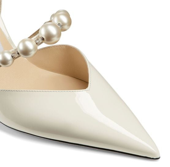 Descrizione: Décolleté in vernice con punta affilata, forma a punta, cinturini con perle, soletta con logo, suola ultrasottile, tacco a spillo.