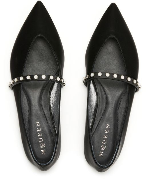 Descrizione: Pelle liscia, tacco piatto, punta affusolata, cinturino con borchie, logo laterale, finitura argento.