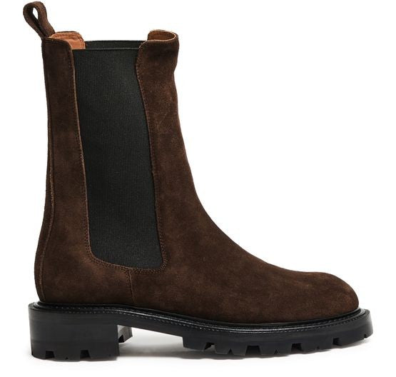 Descrizione: Stivaletti, logo in lettere argentate, pelle scamosciata, tacco a blocco, tacco basso, punta tonda, suola dentellata, soletta con logo stampato, elastici laterali.