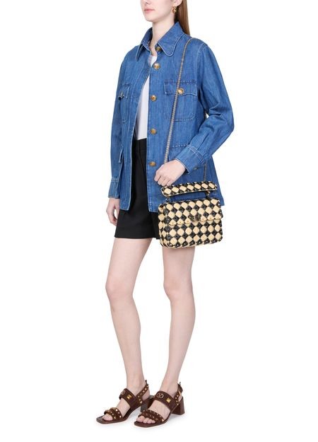 Descrizione: Sandali e ciabatte con cinturini larghi con fibbia, finitura dorata, cuciture a vista, tacco medio, tacco a blocco, soletta con logo, punta quadrata aperta.