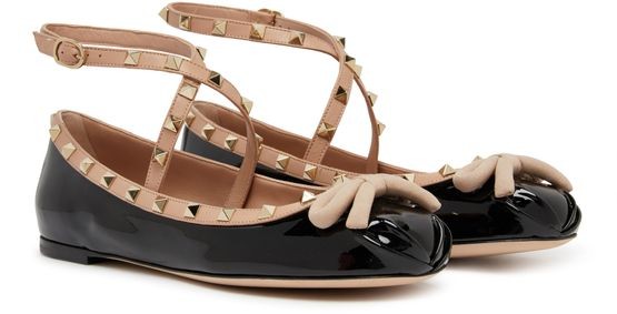 Descrizione: Pelle verniciata, forma sofisticata, parte anteriore annodata, borchie decorative rockstud, cinturino alla caviglia con fibbia, finitura dorata, suola ultrasottile, tacco piatto.