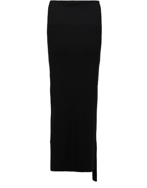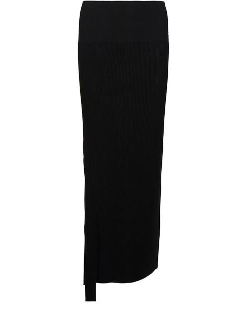 Descrizione: Gonna midi a tubino, cuciture a vista, elastico in vita, spacco anteriore destro.