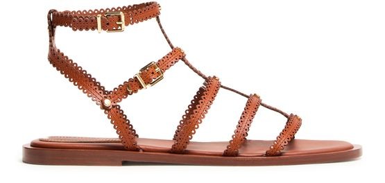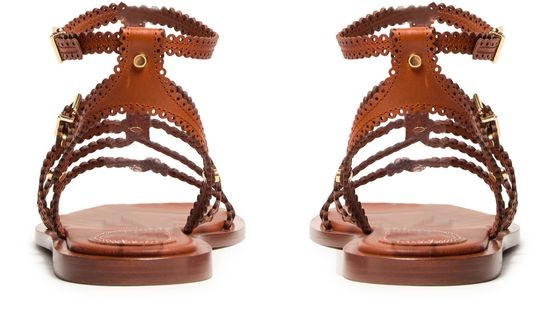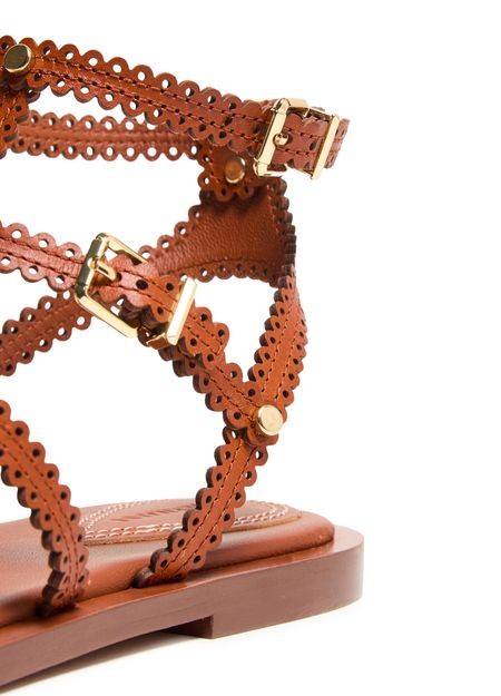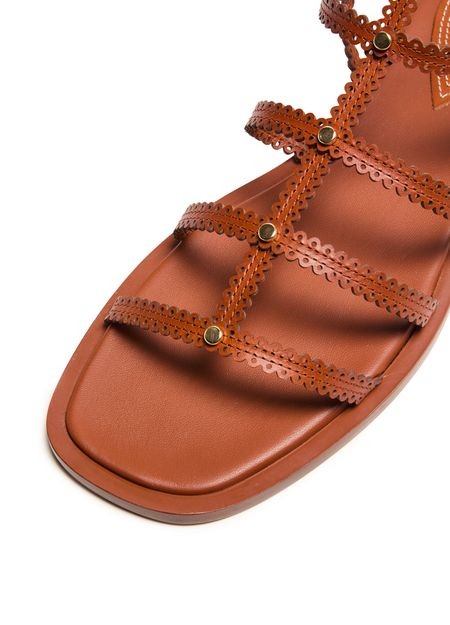 Descrizione: Sandali e ciabatte con cinturino alla caviglia con fibbia, cuciture a vista, logo inciso, finitura dorata, punta tonda piatta e aperta.