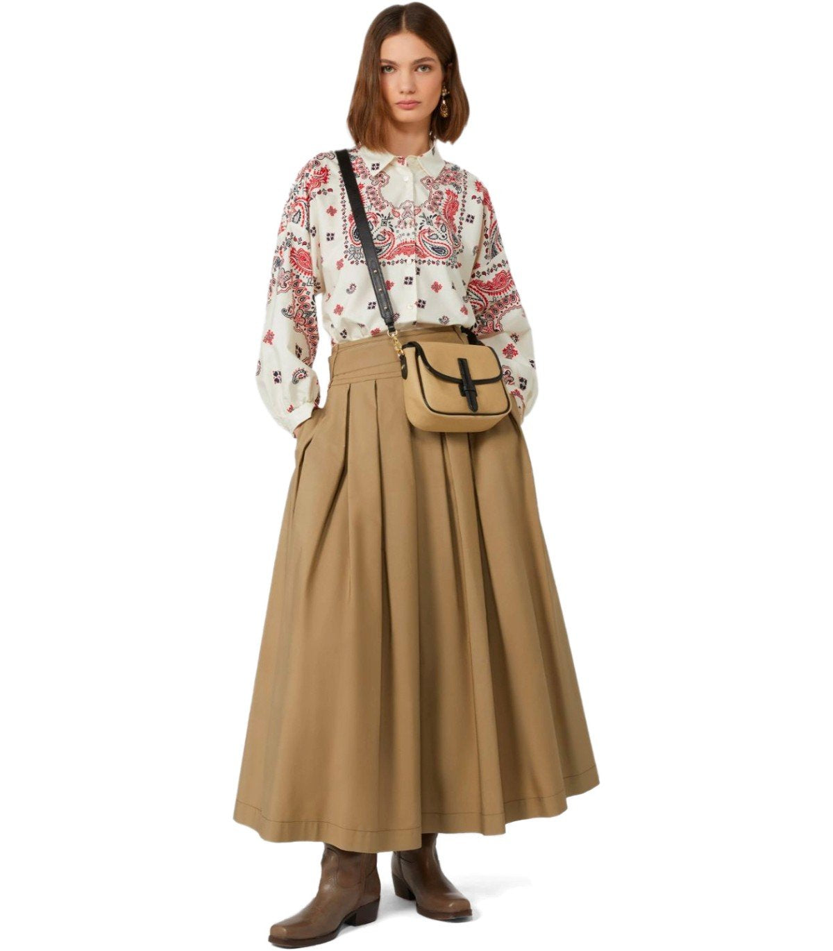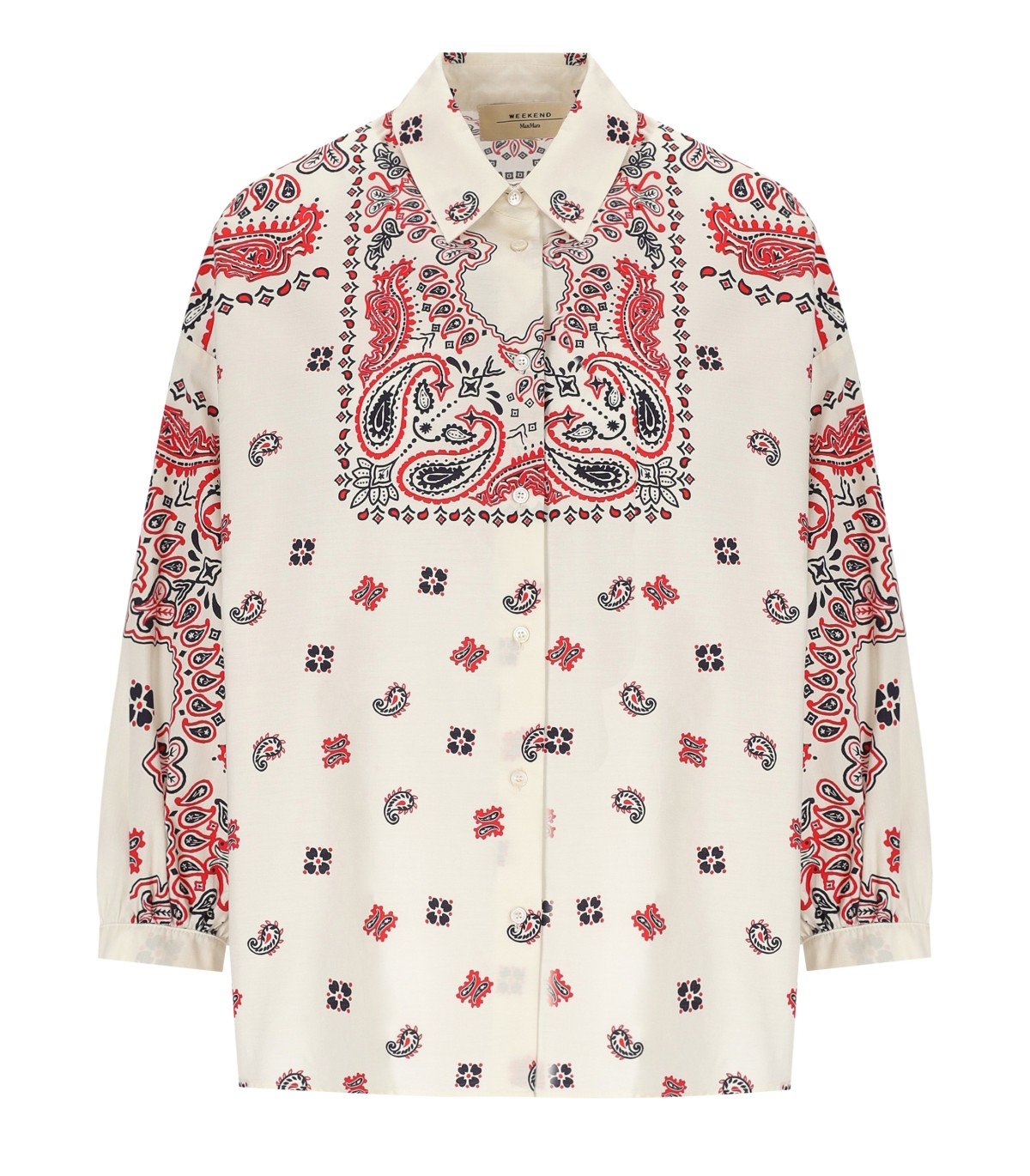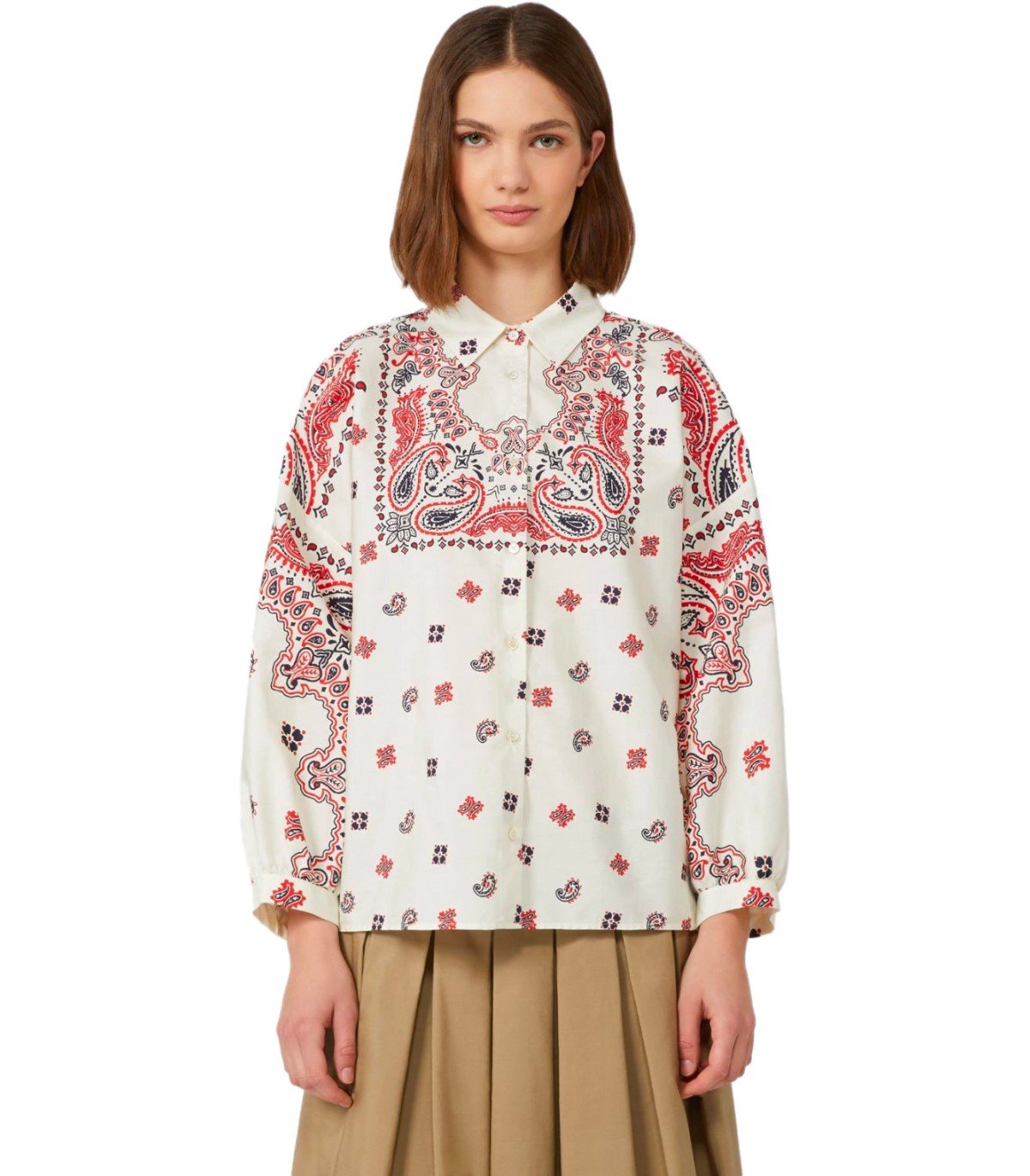 • 赤と海軍のバンダナプリント付きのホワイトコットンポップリンのマックスマラウィークエンドのアダシャツ。長いパフの袖と裾に小さなサイドスリットが特徴です。クラシックカラーとフロントボタンの留め具。ゆるいフィット。 モデルの高さは178 Cmで、サイズ40itを着用しています。 作曲:100%綿。