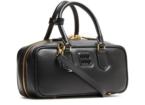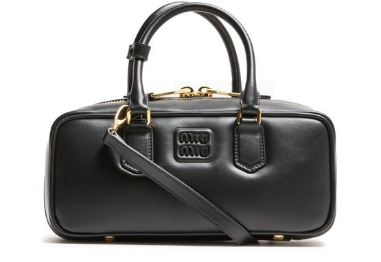 説明 : Shoulder bag, crossbody bag, metallic "miu miu" lettering, smooth leather, double handles, thin strap, adjustable, detachable strap, zipper closure, visible topstitching, front logo.