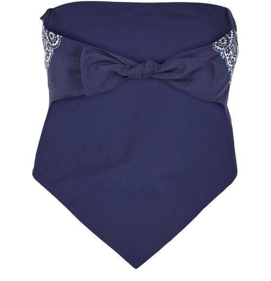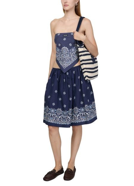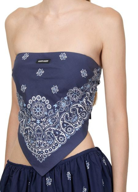 説明 : Decorative label with "miu miu" logo, sleeveless, crop, floral print, paisley pattern, bow fastening, backless.