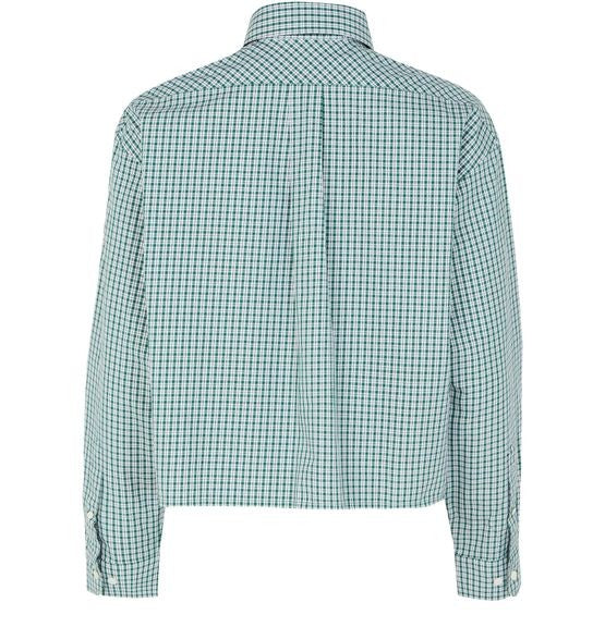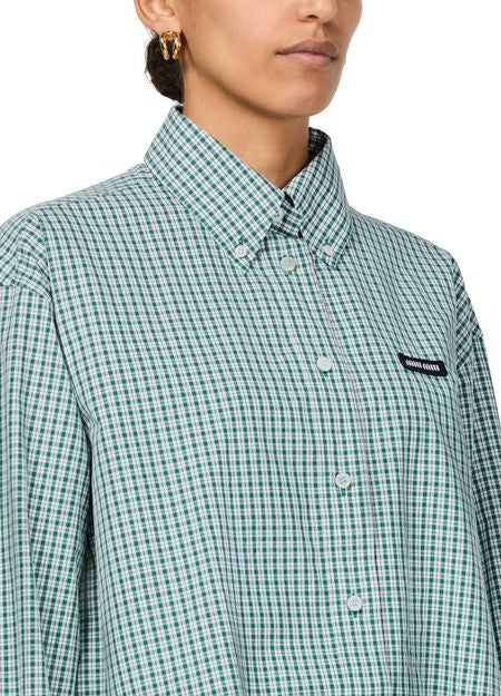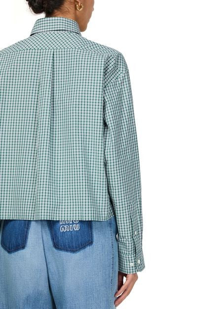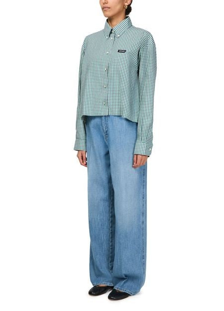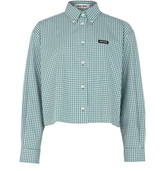 説明 : decorative label with "miu miu" logo, loose fit, long-sleeved, crop, cuffed sleeves, checked pattern, front logo, chest logo, button fastening, buttoned-down collar.