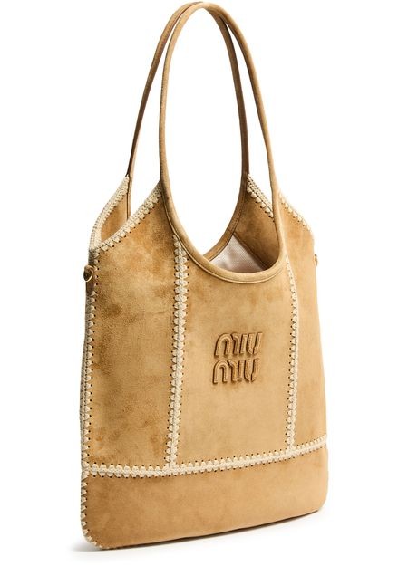 説明 : Shopper / tote bag, metallic "miu miu" lettering, double handles, leather handle, suede, zippered interior pocket, visible topstitching, gold finish.