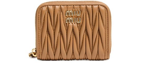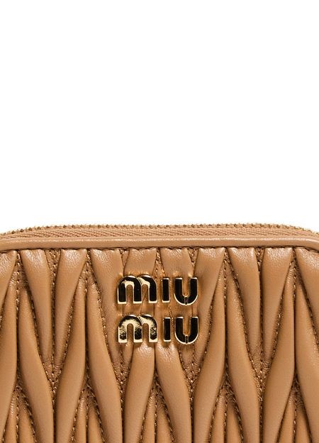 説明 : Wallets, metallic "miu miu" lettering, signature quilted herringbone detail, interior slots for cards, zipper closure, visible topstitching, front logo, gold finish.