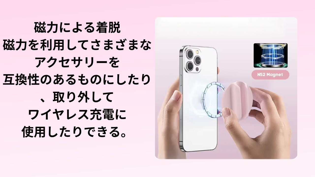 このMagSafe対応の多機能リップホルダーは、iPhone 16 / 15 / 14 / 13 / 12シリーズに対応し、MagSafeケースや非対応ケースでも使えるマグネットリング付き。