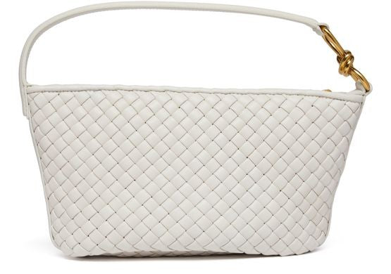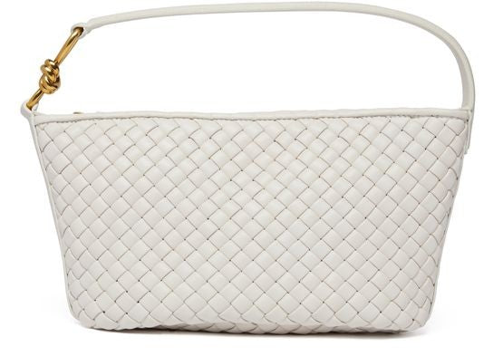説明 : 1ハンドル, ファスナー開閉, イントレチャート製法による編み込み, シグニチャーノット, メタル仕上げ, ゴールド仕上げ, 手持ち.