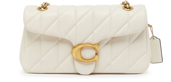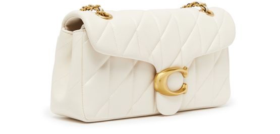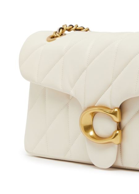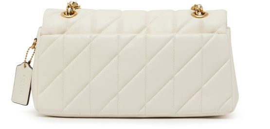 説明 : 金文字ロゴ, フロントのメタリックロゴ, 肩掛け, チェーンストラップ, ナローストラップ, パッド入りテクスチャー, ゴールド仕上げ, 飾りステッチ, フラップ開閉式, スナップボタン留め.