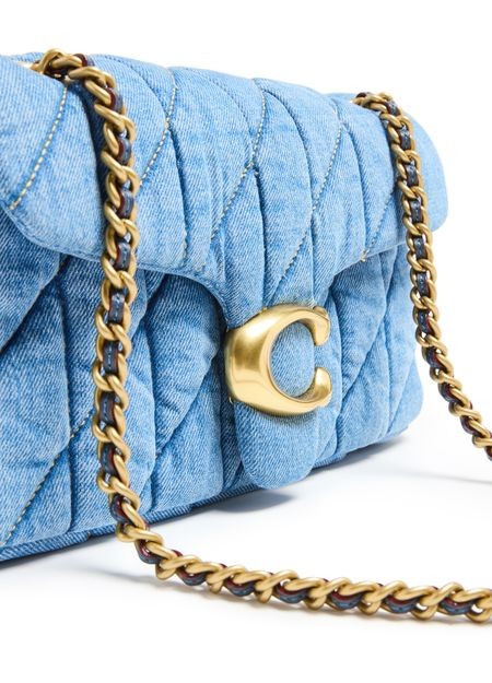 説明 : フロントのメタリックロゴ, 飾りステッチ, ナローストラップ, チェーンストラップ, 肩掛け, スナップボタン留め, フラップ開閉式, ダブルハングル, パッド入りテクスチャー, ゴールド仕上げ.