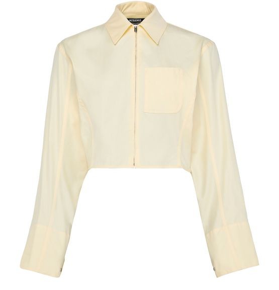 説明 : ファスナー開閉, アップリケロゴ, 目に見えるステッチ, シャツカラー, クロップ, ブレストポケット, パッチポケット, ロングスリーブ, ブラウス, ボタン付きカフス.