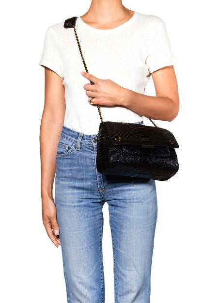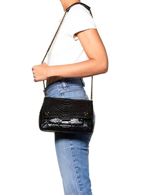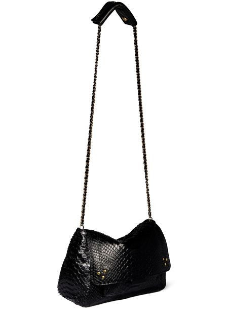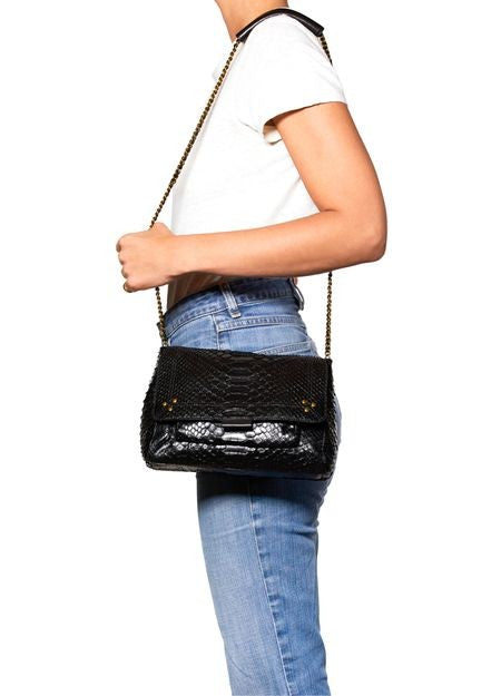 説明 : ミディアムサイズバッグ, スネークスキン調レザー, チェーンストラップ, フラップ開閉, 肩掛け/斜め掛け.
