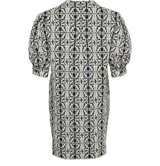 説明 : コンシールバックファスナー, 目に見えるステッチ, ミニドレス, クルーネック, 七分袖, aラインカット, カフス, プリント, 総柄.