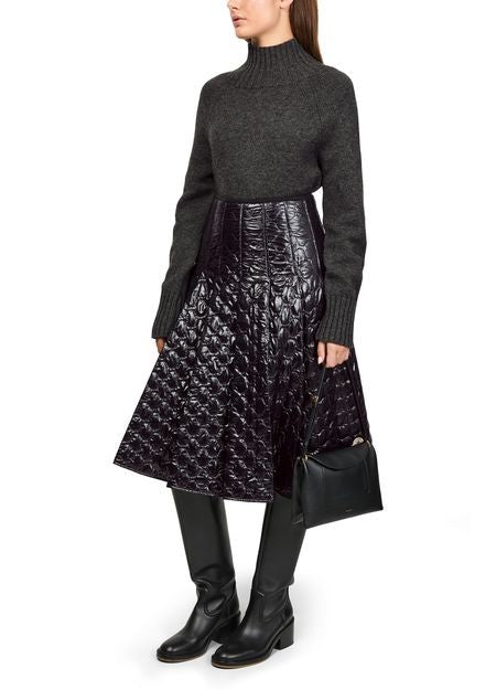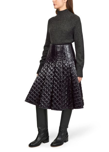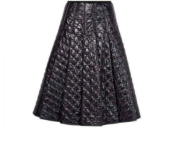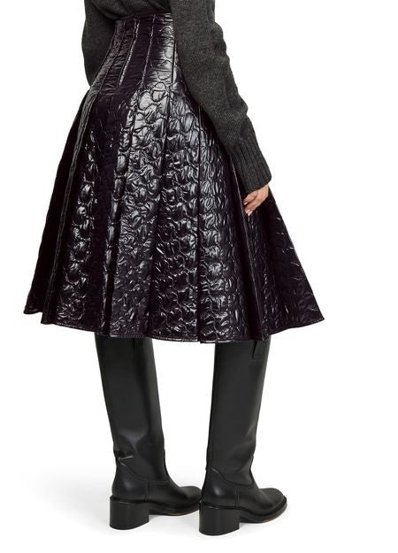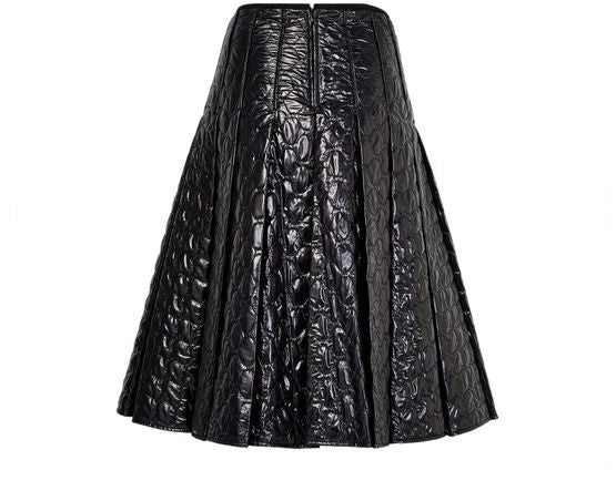 説明 : Diamond pattern, patent leather, knee length, pleated details, visible stitching, back zipper closure, padded texture.