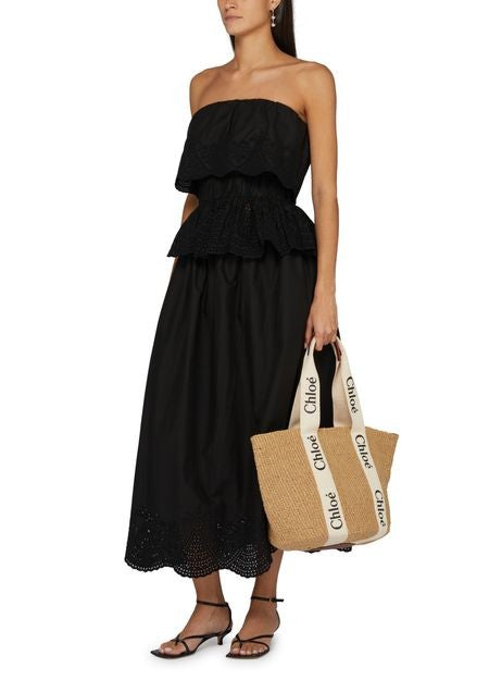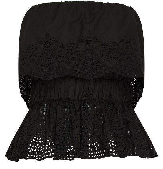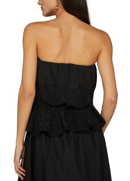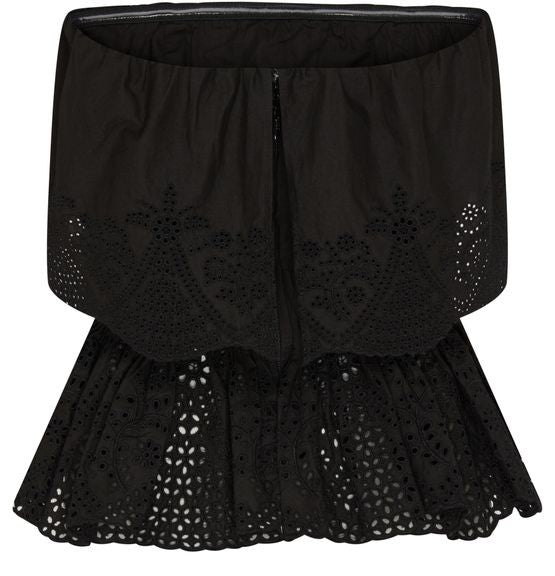 説明 : バックファスナー開閉, バックレス, ラッフルのディテール, アップリケロゴ, 目に見えるステッチ, レギュラーレングス, ベアショルダー, ブラウス, フィットウエスト.