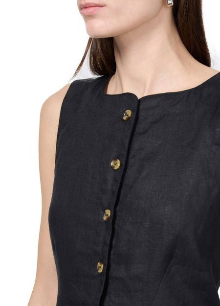 説明 : フロントボタン留め, アップリケロゴ, 目に見えるステッチ, レギュラーレングス, 2フロントポケット, パッチポケット, ノースリーブ, レクタングルネック, ブラウス, バックスリット.