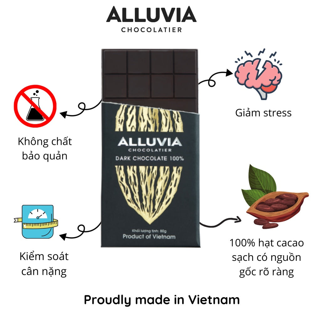 The passionate, strong flavor of ALLUVIA CHOCOLATE 100% will bring an unforgettable feeling from the natural fruit flavor essence contained in Cacao, making it a suitable product for dieters.
