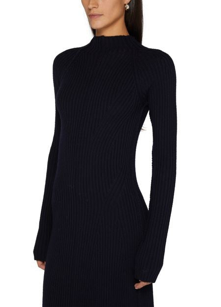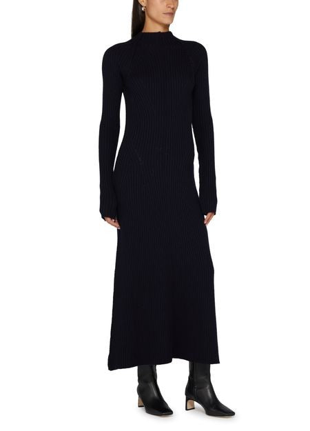 説明 : アップリケロゴ, 目に見えるステッチ, ミディドレス, ロングスリーブ, ニットドレス, フレアドレス, ハイネック, フィットウエスト.