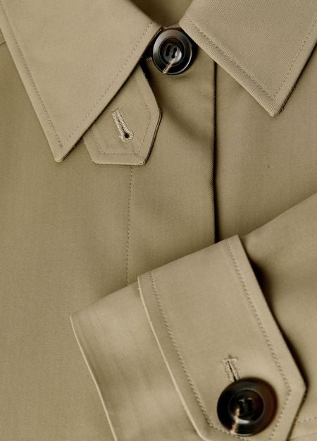 説明 : Long, collar, long-sleeved, welt pockets, concealed zipper closure.