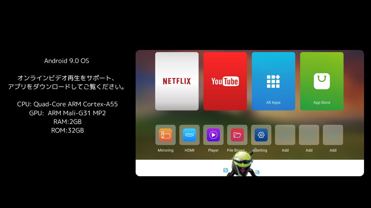 項目内容プロジェクション方式DLP 0.2" WVGA DMD解像度854×480P (4K互換)明るさ100 ANSIルーメンコントラスト比3000:1プロジェクションサイズ10~200インチプロジェクション距離0.25〜5.3mOSAndroid 9.0RAM/ROM2GB/32GBWi-Fi / Bluetooth2.4G/5G / BT 5.0バッテリー2〜3時間稼働ランプ寿命約30,000時間インターフェースUSB1 / HDMI1 / AUDIO*1 / DC 15V言語日本語、英語、スペイン語、韓国語 イタリア語 ロシア語 重量約226gサイズ145×80×19mm保証期間1年間