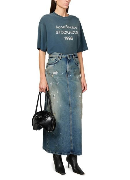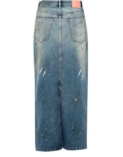 説明 : フロントボタン留め, ボタン&コンシールファスナー開閉, ミディ, 背面ロゴ, アップリケロゴ, ストレートスカート, ベルトループ, パッチディテール, サイドポケット, バックパッチポケット.