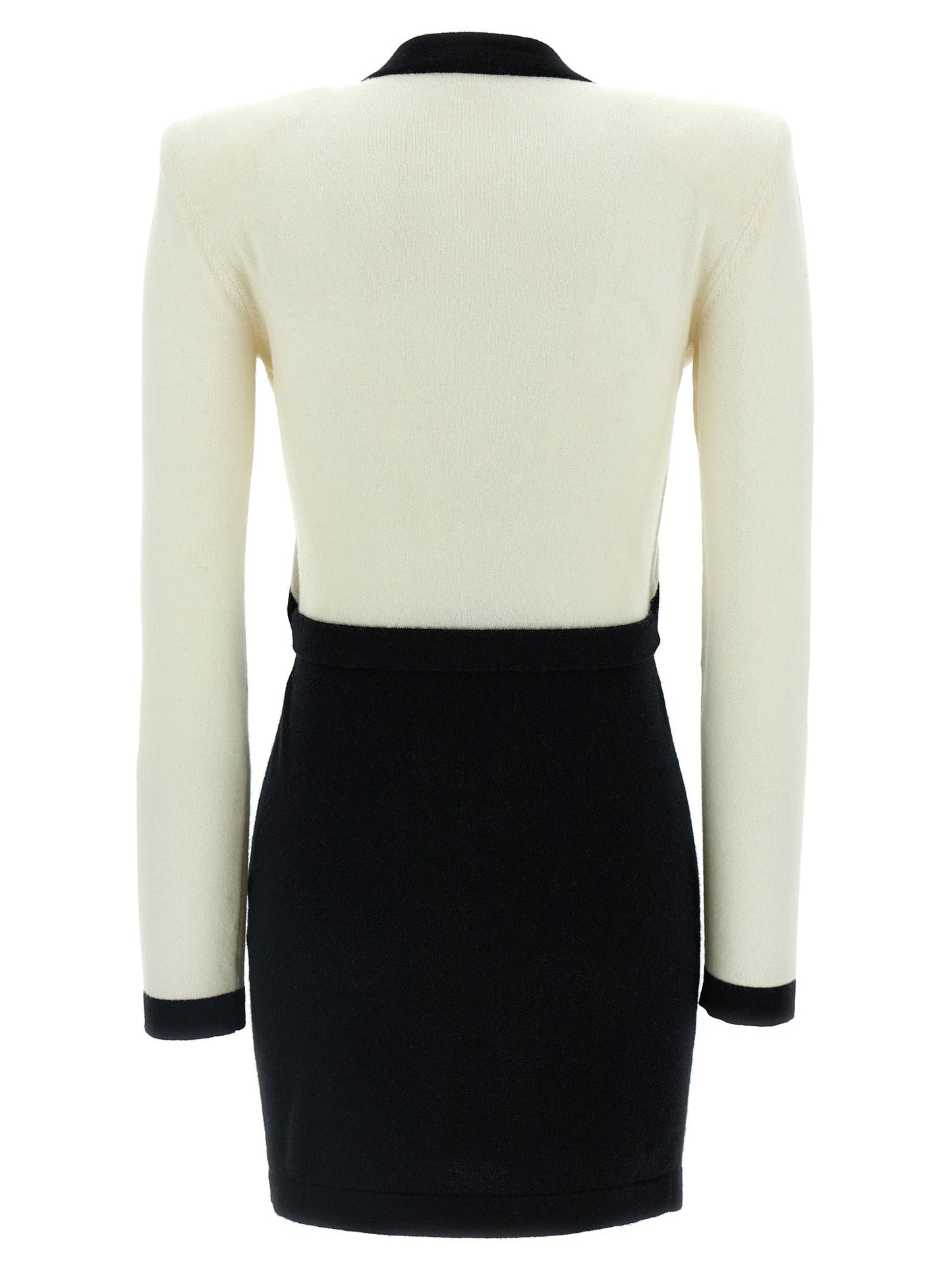 ウールとカシミアのブレンドドレスとトロンプ l「Oeilの詳細と「Filo Leone Catena」ボタン、レイヤードカーディガン、クルーネック、パッド入りの肩、長袖。 バルメイン 「Filo Leone Catena」ドレス スリムフィット フランスのサイズ
