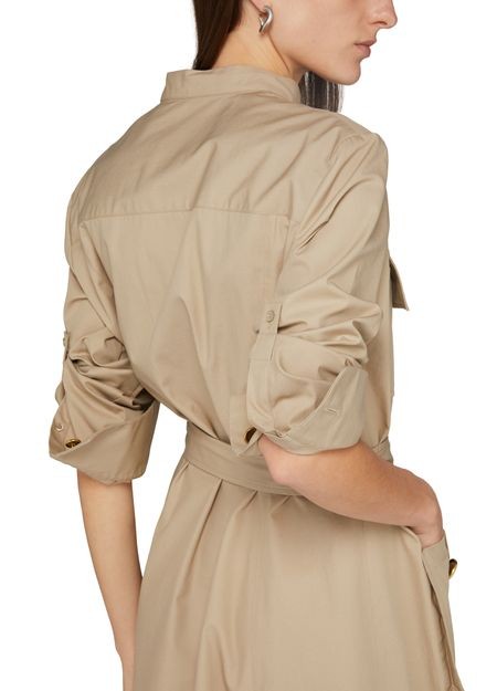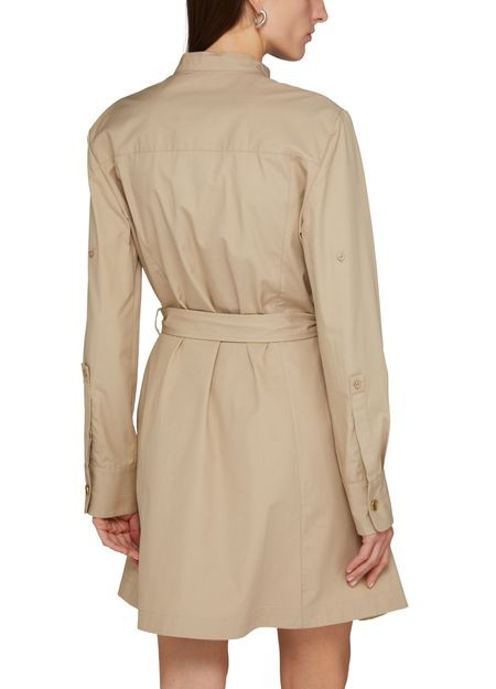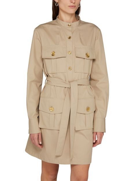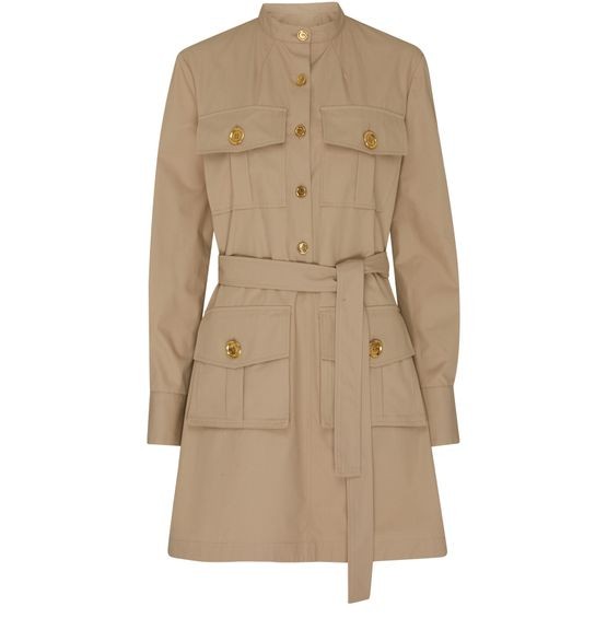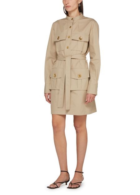 説明 : フロントボタン留め, ベルトループ, アップリケロゴ, 目に見えるステッチ, マンダリンカラー, ミニドレス, 2フロントポケット, フラップポケット, ロングスリーブ, aラインカット.