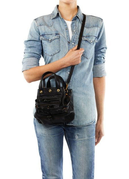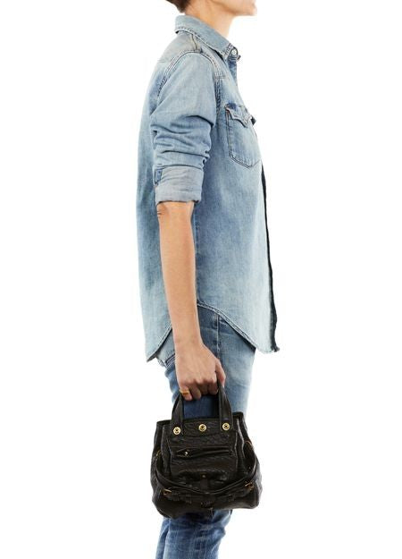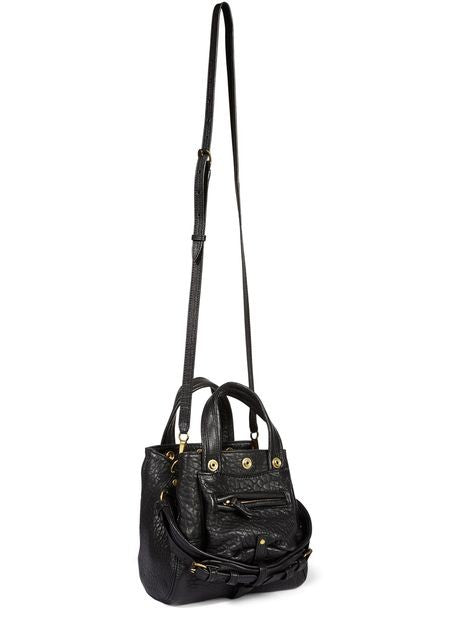 説明 : テクスチャードレザーバッグ, 取り外しと調節の可能なナローストラップ, ダブルハンドル, ファスナーポケット, エンボスロゴ, ゴールドメタル仕上げ, 手持ち/肩掛け/斜め掛け.