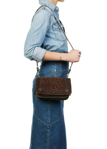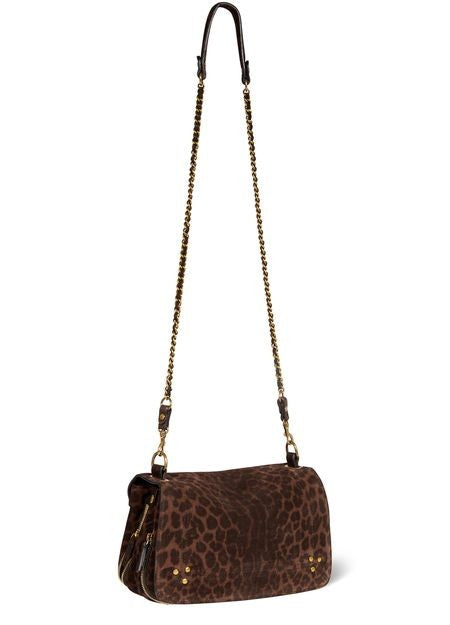 説明 : マグネットクロージャー, フラップ開閉式, シングルコンパートメント, ゴールド仕上げ, シングルハンドル, フロントのメタリックロゴ, 総柄, レオタード柄, 飾りステッチ, 取り外し可能なストラップ.