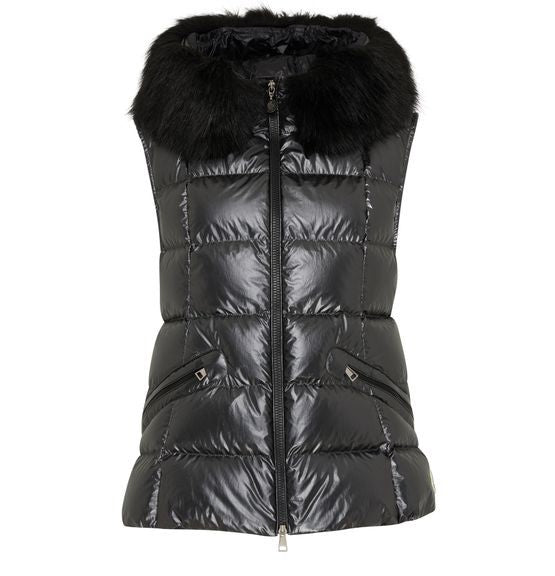 説明 : ノースリーブ, 前面ロゴ, ベスト, パフジャケット, ショート, ファスナー開閉, サイドポケット, ファーディテール, パッド入り.
