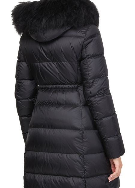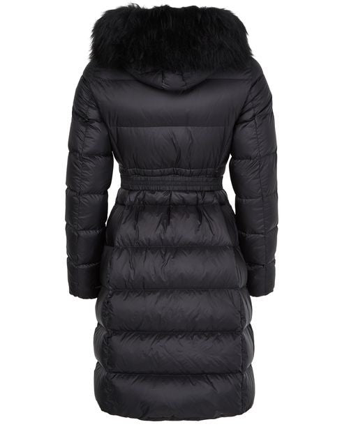 説明 : Long, hood, long-sleeved, side pockets, zipper closure, padded texture, fur detail.