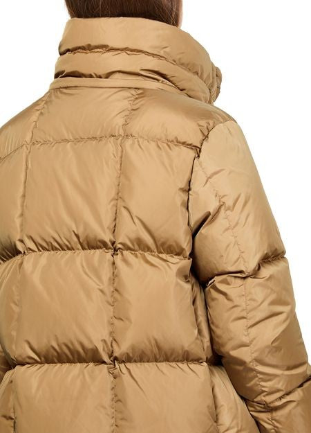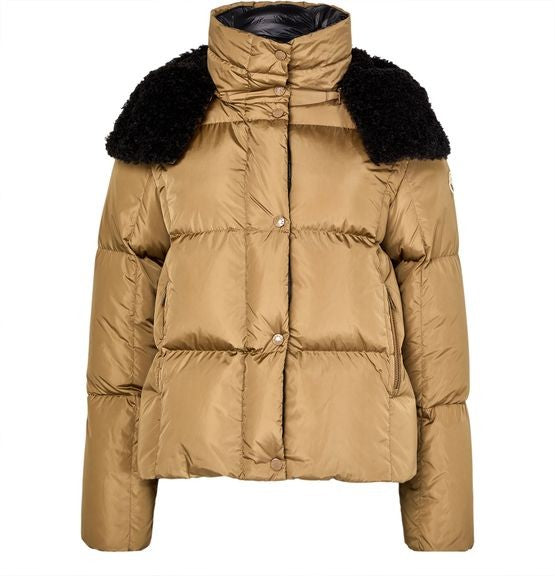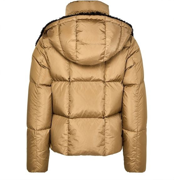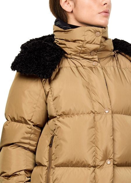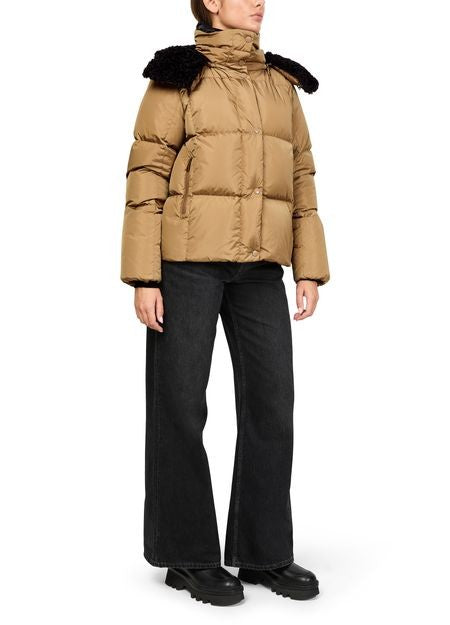 説明 : Short, hood, long-sleeved, side pockets, buttoned zipper closure, padded texture, fur detail.
