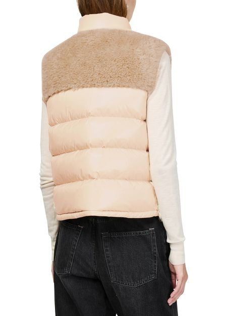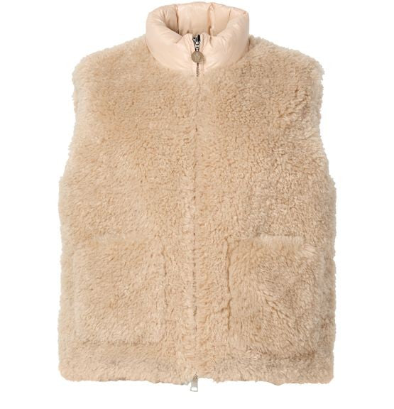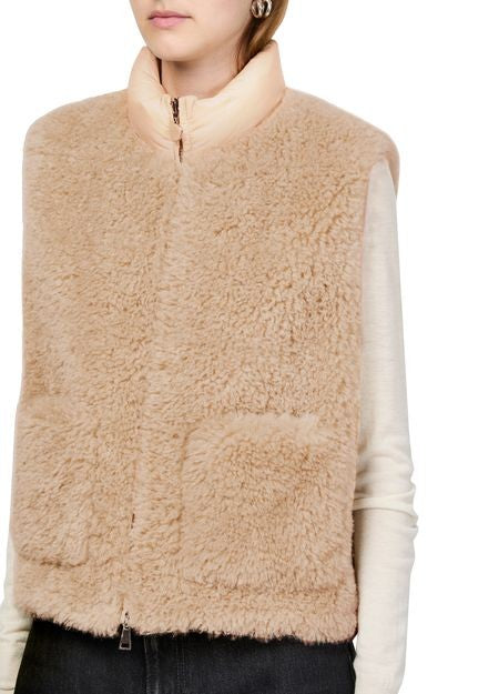 説明 : Warm fabric, bi-material, regular fit, zipper closure, sleeveless, high neck, patch pockets, fur detail, padded texture.