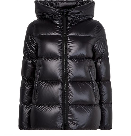 説明 : Glossed leather, short, hood, long-sleeved, side pockets, zipper closure, padded texture.