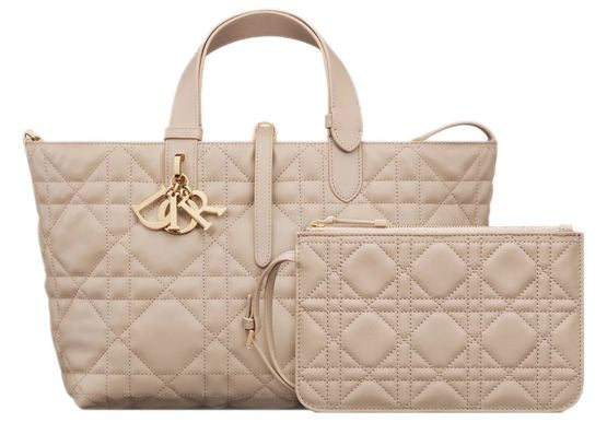 説明 : Double closure: a thin lace-through strap and a Christian Dior Pa, d.I.O.R. charms, removable interior pouch, adjustable leather top handles.