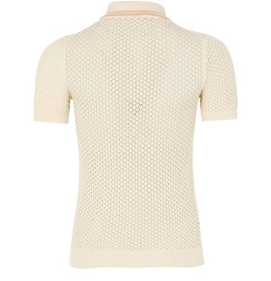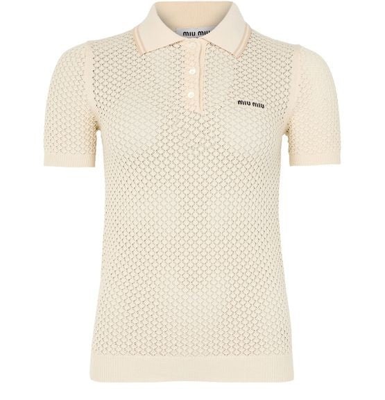 説明 : Embroidered "Miu Miu" logo, chest logo, open weave, polo-shirt collar, short-sleeved, button fastening, embroidered details.
