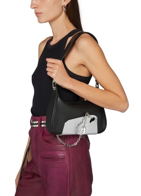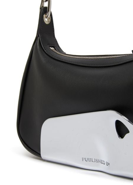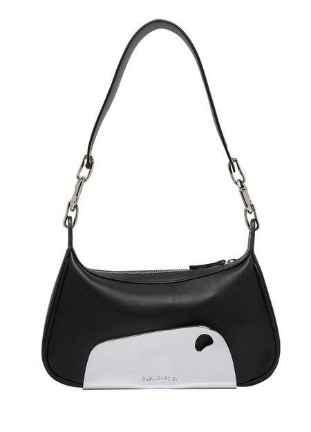 説明 : ファスナー開閉, シングルコンパートメント, シルバーフィニッシュ, シングルハンドル, 前面ロゴ, 銀文字ロゴ, 飾りステッチ, 肩掛け, ワイドストラップ.