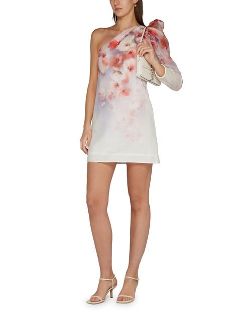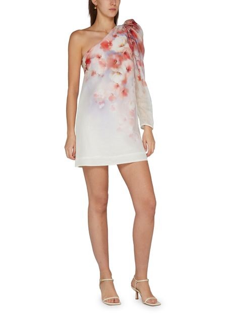説明 : ミニドレス, ロングスリーブ, ベアショルダー, アシンメトリーネックライン, 花柄, ジゴット袖, aラインカット.